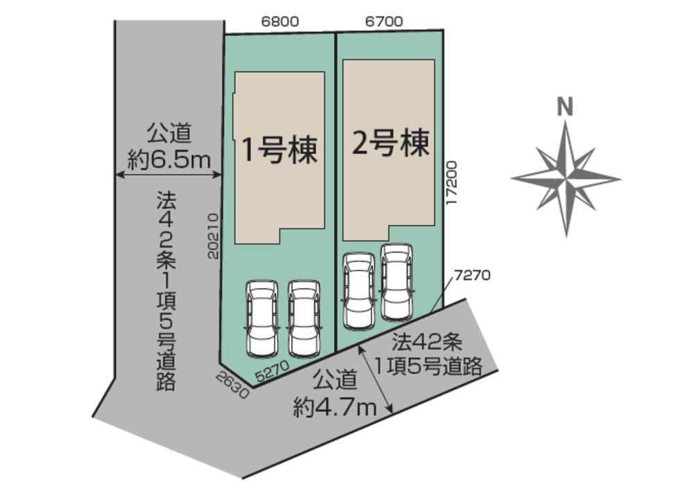 西側6. 5m公道42条1項5号道路、南側 4.7m公道42条1項5号道路