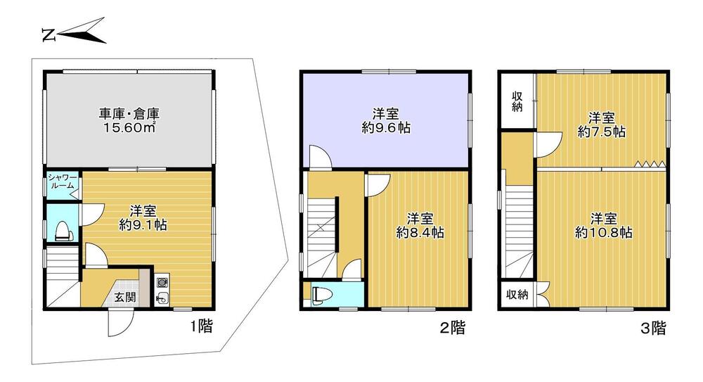 シャッター付倉庫/車庫、3階洋室は可動式の間仕切有り